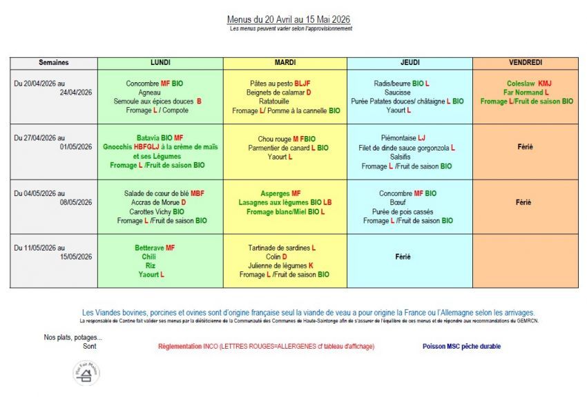 > Actualités > Menus cantine du 20 avril au 15 mai